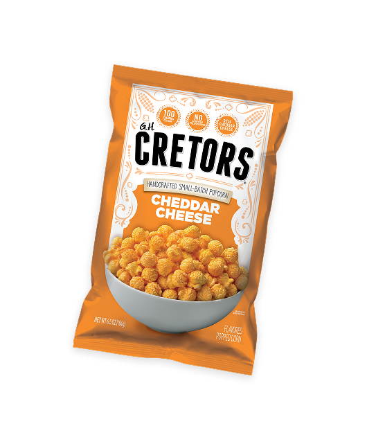 Looking for a delectable, savory snack? You’ve come to the right place! G.H. Cretors Cheddar Cheese is handcrafted with premium, sharp cheddar cheese over our fluffy, gourmet popcorn we know you’ll love. We’ve perfected the art of full flavor cheese popcorn. Just trust us.